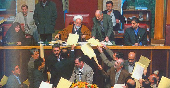 برخوردها اما در درون مجلس بسیار صریحتر بود. در واقع به استثنای سالهای اولیه پس از انقلاب، این نخستین بار در تاریخ جمهوری اسلامی بود که حکم رسمی صادره در دادگاه با چنین حجمی از انتقادات نمایندگان وقت مجلس شورای اسلامی روبرو شد. مهدی کروبی که آن زمان پس از سالها به هرم قدرت بازگشته بود به عنوان رییس ششمین دوره مجلس شورای اسلامی، در صحن علنی مجلس، صدور حکم اعدام برای هاشم آغاجری را ننگین توصیف و رسماً از آن ابراز انزجار و تنفر کرد. ویگفت: «نسبت دادن انکار ضرورت دین به انسانی که روزه گرفته و نماز میخواند چه مفهومی دارد؟ مطمئن هستم که هیچ یک از قضات قوه قضاییه و مراجع و علما این حکم را قبول ندارند و با آن موافق نیستند.»