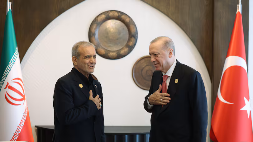 مسعود پزشکیان، رئیسجمهور ایران (سمت چپ) و رجب طیب اردوغان، همتای ترکیهای او، در نشست سران سازمان همکاری اقتصادی (اکو) در خانکندی، آذربایجان؛ ژوئیه ۲۰۲۵.