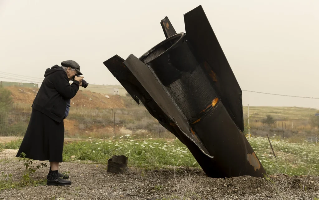 یک زن اسرائیلی پس از موج حملاتی که توسط جمهوری اسلامی انجام شد، از یک موشک ایرانی عکس میگیرد.